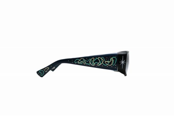 天地幅の狭いロークシェイプが特徴のモデルで、フロントからテンプルまで流れるように幅をキープした極太テンプルが特徴のモデルです。