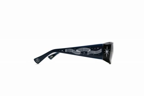 天地幅の狭いロークシェイプが特徴のモデルで、フロントからテンプルまで流れるように幅をキープした極太テンプルが特徴のモデルです。