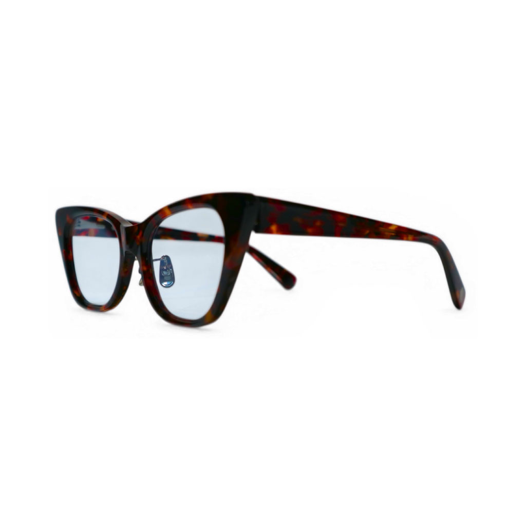 フラットレンズを採用しているので、反射が強くモードな雰囲気に仕上げていながらも、リムを細く設定し、丸みをつけるように磨く事でエッジが出過ぎず、顔馴染みを良くしているのでジェンダーレスに着用出来るもポイントです。