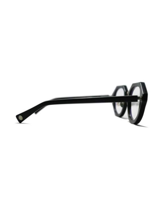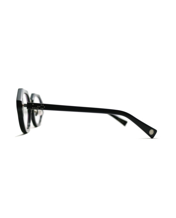 厚めに設定したリムと、大ぶりなサイズ感がモードな雰囲気を演出し、フロントエンドにはヘキサゴンスタッズ、テンプルエンドにはブランドロゴを埋め込み、上品な趣の中に遊び心を込めた一本です。